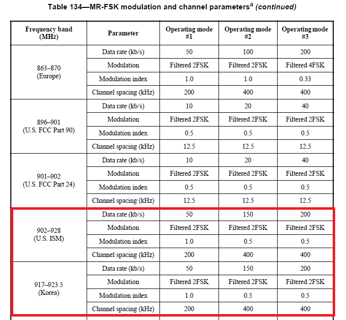 Fortunately, US(ISM) 902-928 is covering the Korean frequency band(917~923.5MHz by changing the center frequency macro and the channel number properly. Of course, the other phy spec. are the same as the following, according to the IEEE 802.15.4g-2012,