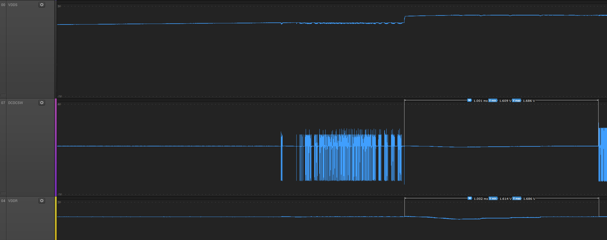 I have an application where the input on VDDS will rise and fall with slew rates close to (and sometimes beyond) the limits specified in the datasheet. In some cases, I observe that VDDR then drops to below 1.65V and the CC1350 subsequently reboots due to brown-out detection (see screenshot from Saleae Logic at the bottom). I have a few questions related to this: