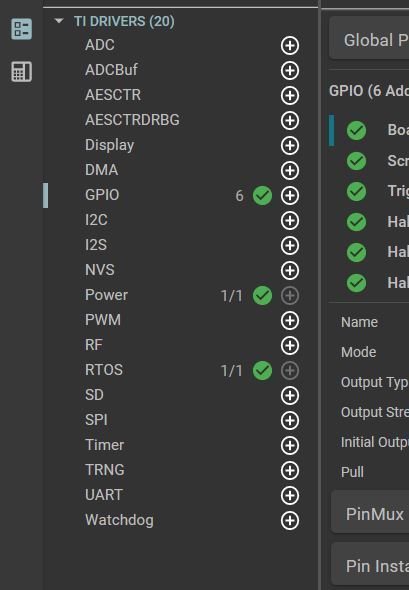 /** * These arguments were used when this file was generated. They will be automatically applied on subsequent loads * via the GUI or CLI. Run CLI with '--help' for additional information on how to override these arguments. * @cliArgs --device "CC1310RSM" --package "RSM" --part "Default" --product "simplelink_cc13x0_sdk@4.10.01.01" * @versions {"data":"2020052512","timestamp":"2020052512","tool":"1.5.0+1397","templates":"2020052512"} */ /** * Import the modules used in this configuration. */ const GPIO = scripting.addModule("/ti/drivers/GPIO", {}, false); const GPIO1 = GPIO.addInstance(); const GPIO2 = GPIO.addInstance(); const GPIO3 = GPIO.addInstance(); const GPIO4 = GPIO.addInstance(); const GPIO5 = GPIO.addInstance(); const GPIO6 = GPIO.addInstance(); const Power = scripting.addModule("/ti/drivers/Power"); const RTOS = scripting.addModule("/ti/drivers/RTOS"); /** * Write custom configuration values to the imported modules. */ GPIO1.mode = "Output"; GPIO1.initialOutputState = "High"; GPIO1.$name = "Board_LED"; GPIO1.gpioPin.$assignAllowConflicts = "DIO_0"; GPIO1.pinInstance.$name = "Board_PIN0"; GPIO2.$name = "ScrewSense"; GPIO2.interruptTrigger = "Rising Edge"; GPIO2.callbackFunction = "SenseScrewISR"; GPIO2.gpioPin.$assignAllowConflicts = "DIO_1"; GPIO2.pinInstance.$name = "Board_PIN1"; GPIO3.interruptTrigger = "Low"; GPIO3.callbackFunction = "HallTriggerISR"; GPIO3.$name = "Trigger"; GPIO3.gpioPin.$assignAllowConflicts = "DIO_6"; GPIO3.pinInstance.$name = "Board_PIN2"; GPIO4.$name = "Hall1"; GPIO4.pinInstance.$name = "Board_PIN3"; GPIO5.$name = "Hall2"; GPIO5.gpioPin.$assignAllowConflicts = "DIO_8"; GPIO5.pinInstance.$name = "Board_PIN4"; GPIO6.$name = "Hall3"; GPIO6.pinInstance.$name = "Board_PIN5"; Power.policyFunction = "PowerCC26XX_doWFI";