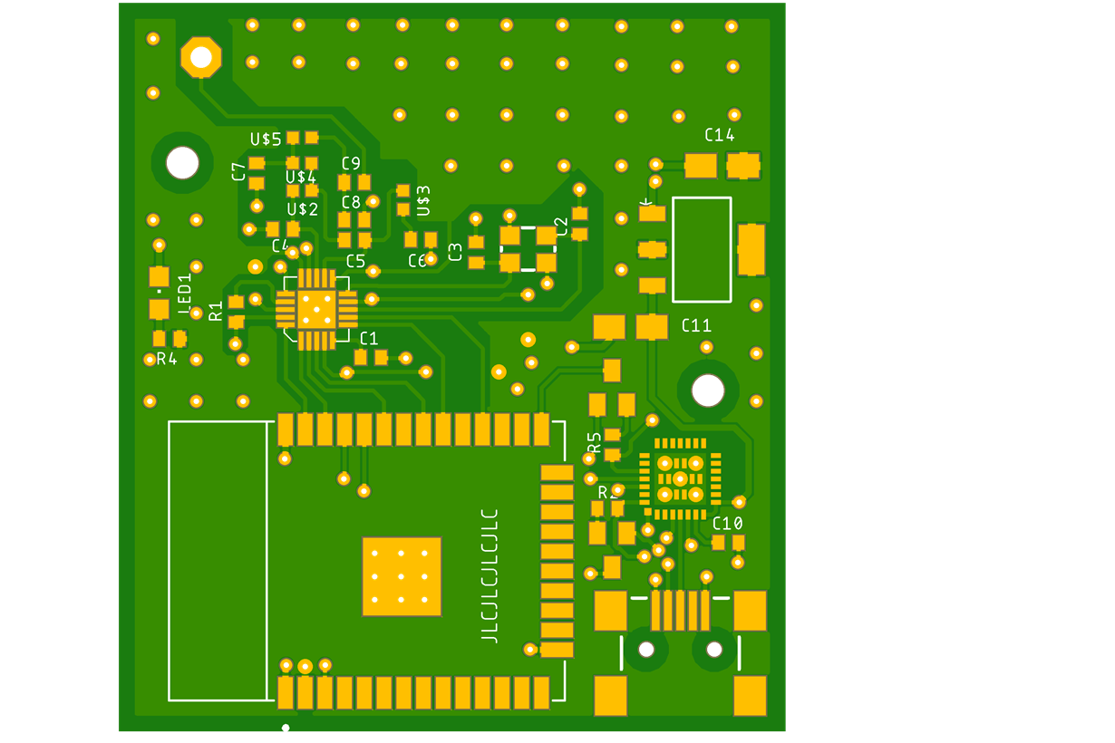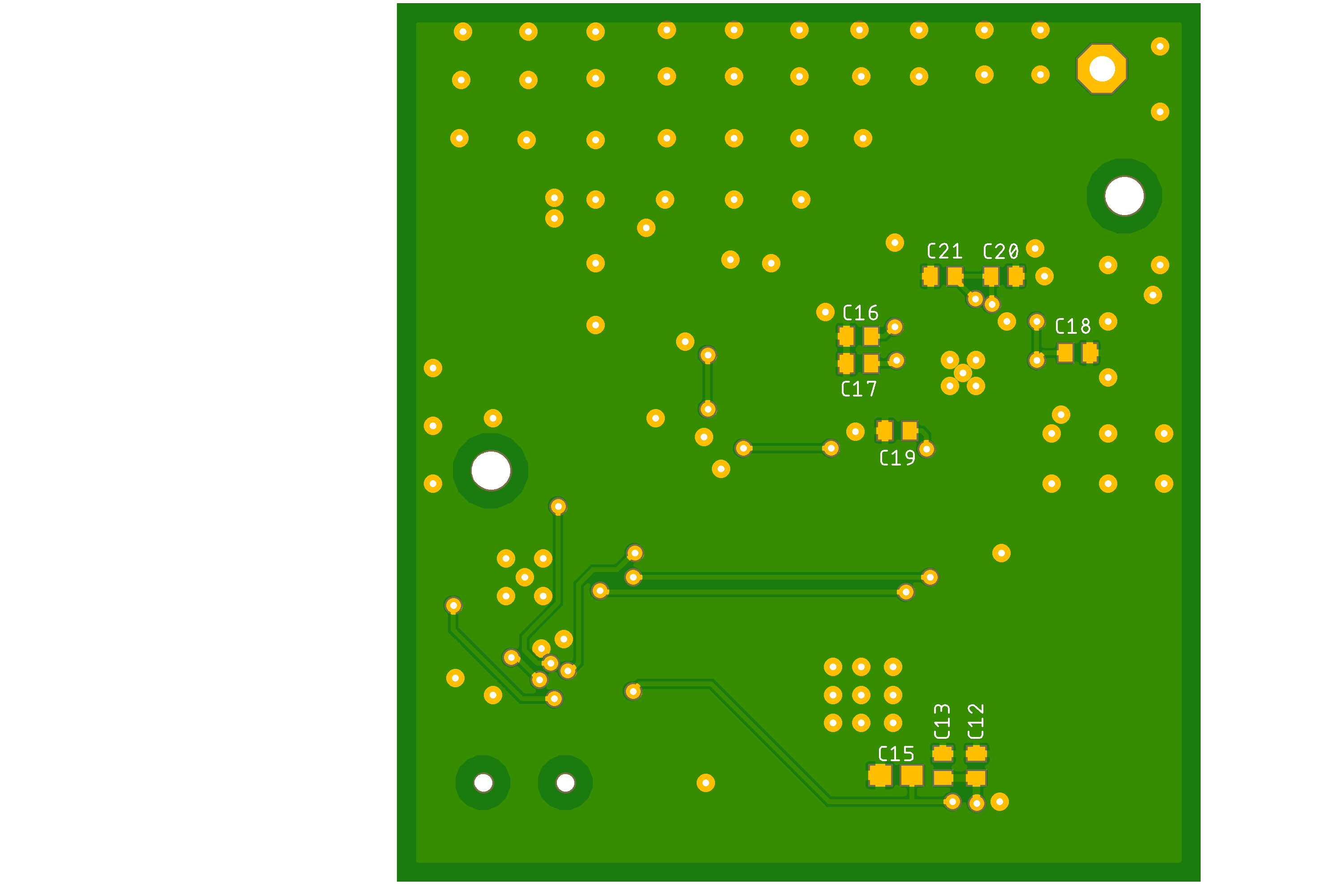 Hey, I'm new in RF design and would like to make a pcb with CC1101. I use esp32 micro controller and cp2102 in UART communication. All passive components are in 0402 packages, RF chip is connected via lines with 0.254 mm width, and 6 mil gaps between lines. In my production I'm gonna use FR-4 with 1.6mm thickness. I'm interested is it ok to have bypass capacitors on the bottom side and connected through vias? Also I looked at other boards and all of them use vias on the polygon, connected to the GND. What for they do this? and I placed vias too, is it ok? My aim to get 433 MHz transmitter/receiver