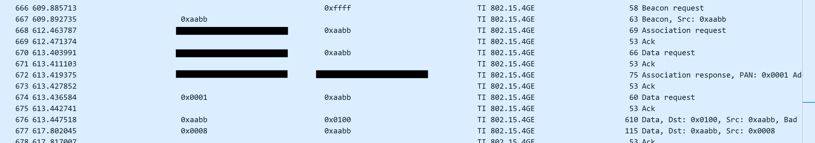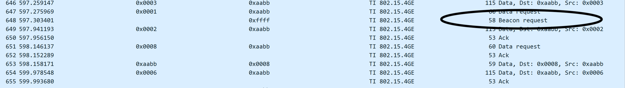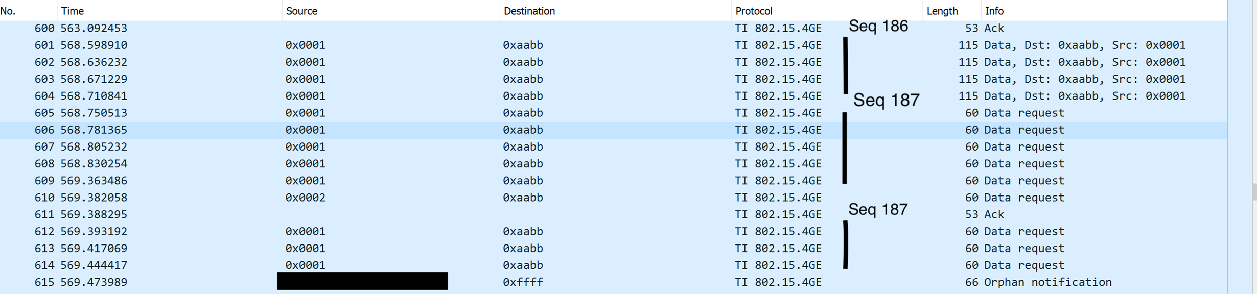 I am occasionally seeing one sensor disconnect from the network. It is not consistently the same sensor, and appears to rotate between a few. I have sniffed the traffic. It appears the disconnecting sensor does not receive an ACK, and rapidly tries to retry the request, leading to itself disconnecting. It's unclear why the sensor is not receiving an ACK. Once disconnected, I observe the sensor sending beacon requests. These requests are not always answered by the collector, causing further delay in reconnecting. The sensor typically reconnects after 10 or so minutes.