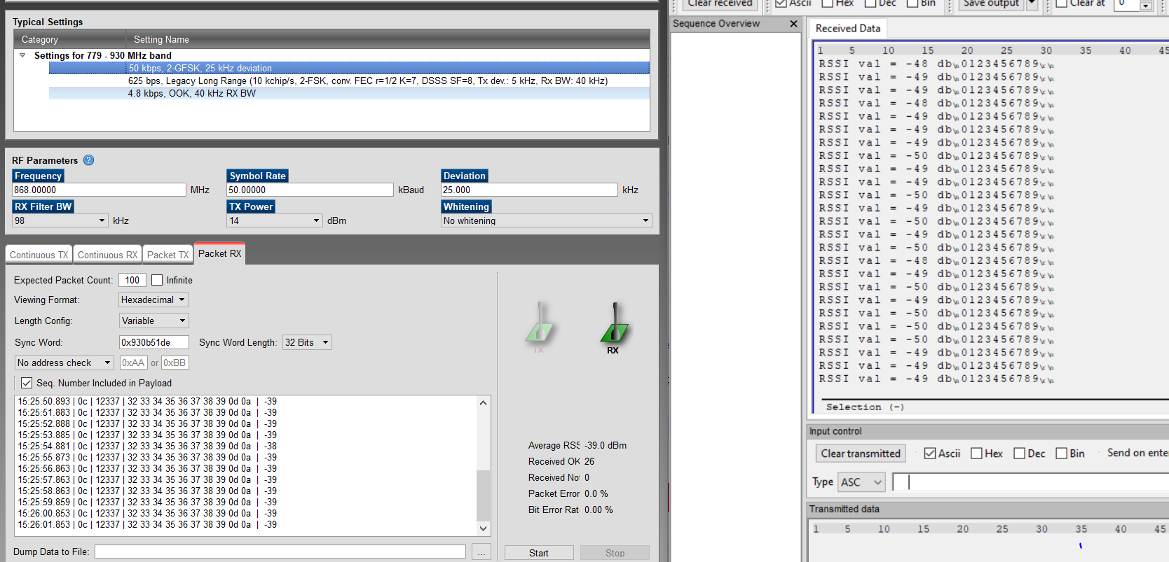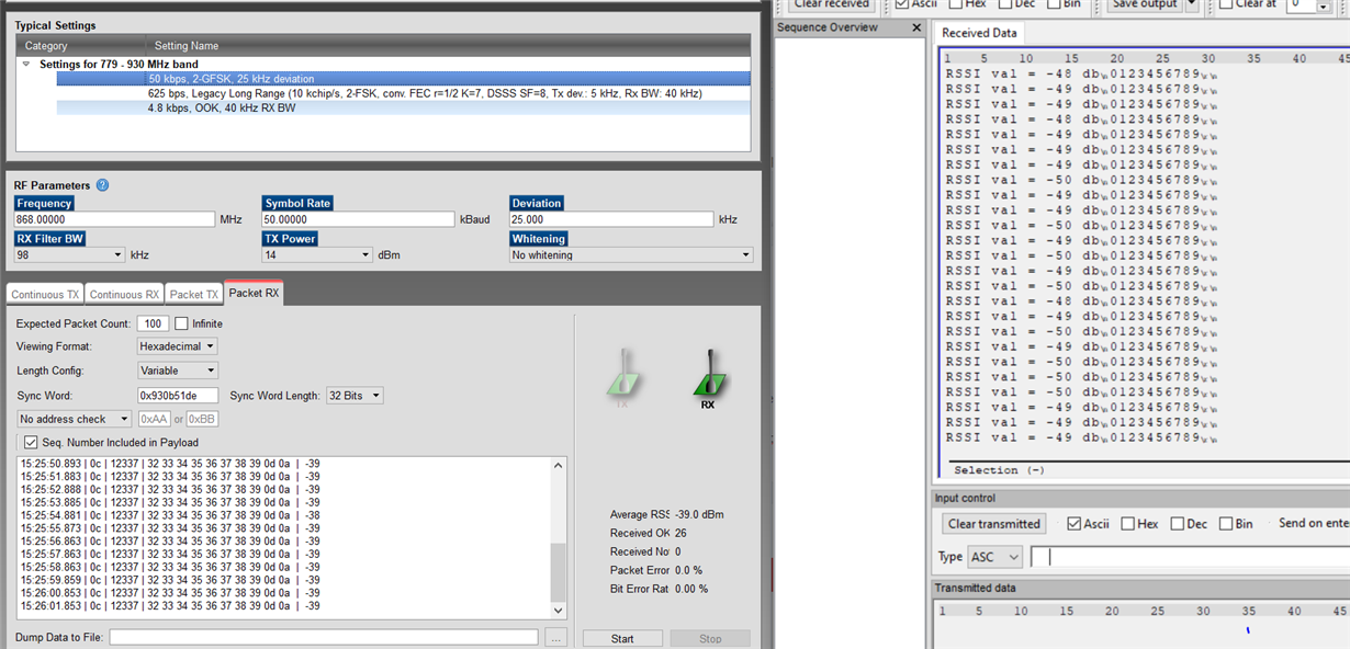 as you can see in up picture, there is a one receiver board and one eval to see rssi value on device control panel. to see rssi value on control panel. I delete all code from board using flash programmer. thus I was able to see rssi value on both board. the distance and transmitted data is same for both board.