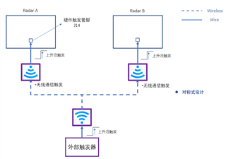Wired synchronization has been achieved, which triggers both development boards simultaneously with an external trigger source triggered by rising-edge triggering. However, wireless synchronization is now required, as shown in the following figure, the customer would like to know is there any device can function as a module in the purple box in the figure: