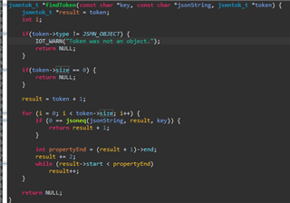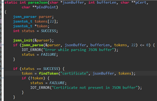 Initially, I was parsing the JSON message with 5 tokens which was the default, but I had to increase this to 22. Now, it will pass the initial if(jsmn_parse()) line.