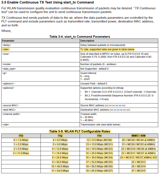 We are using the WiLink8 calibration tool to generate test signals (https://www.ti.com/lit/ug/swru562/swru562.pdf?ts=1657643672356&ref_url=https%253A%252F%252Fwww.google.com%252F). This question centers around the “start_tx” command. More specifically the “rate” parameter of the start_tx command (shown below).
