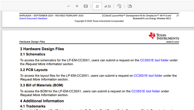 3 Hardware Design Files 3.1 Schematics To access the schematics for the LP-EM-CC35X1, users can submit a request on the CC3551E tool folder under the Request More Information section. 3.2 PCB Layouts To access the layout files for the LP-EM-CC35X1, users can submit a request on CC3551E tool folder under the Request More Information section. 3.3 Bill of Materials (BOM) To access the BOM for the LP-EM-CC35X1, users can submit a request on the CC3551E tool folder under Request More Information section.