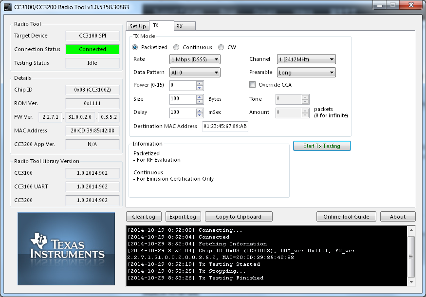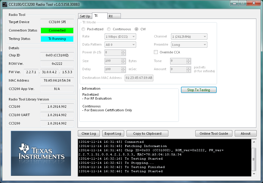 I am trying to get a carrier wave out of my CC3100 (ES) using the radio tool but when I select CW on the TX tab and hit "Start TX Testing" I see nothing on my spectrum analyzer. Looking at the source code for Radio Tool I notices a comment saying CW is currently not supported. Is this still the case?