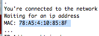 #include <SPI.h> #include <WiFi.h> char ssid[] = "yourNetwork"; // the name of your network int status = WL_IDLE_STATUS; // the Wifi radio's status byte mac[6]; // the MAC address of your Wifi shield void setup() { Serial.begin(9600); status = WiFi.begin(ssid); if ( status != WL_CONNECTED) { Serial.println("Couldn't get a wifi connection"); while(true); } // if you are connected, print your MAC address: else { WiFi.macAddress(mac); Serial.print("MAC: "); Serial.print(mac[5],HEX); Serial.print(":"); Serial.print(mac[4],HEX); Serial.print(":"); Serial.print(mac[3],HEX); Serial.print(":"); Serial.print(mac[2],HEX); Serial.print(":"); Serial.print(mac[1],HEX); Serial.print(":"); Serial.println(mac[0],HEX); } } void loop () {}