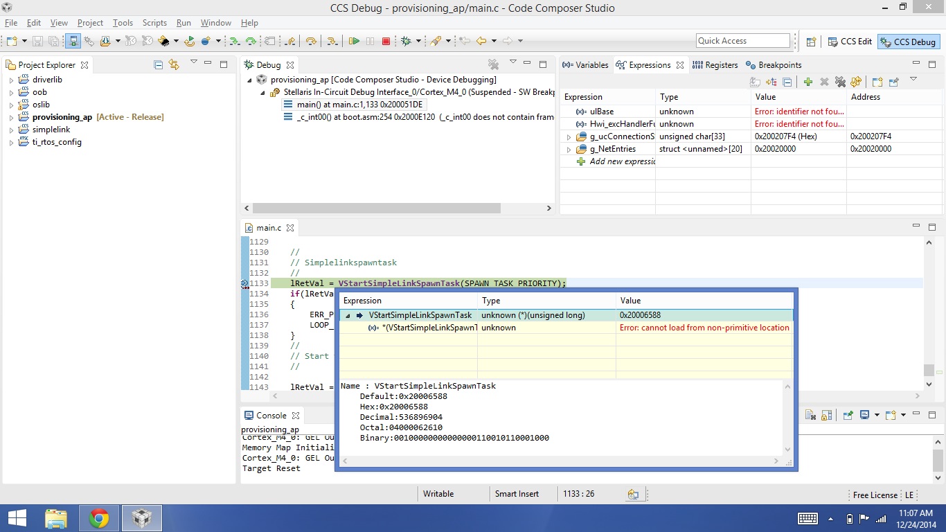 Got the provisioning_ap example building successfully in my workspace, and modified it so that it would use TI-RTOS instead of FreeRTOS by going into the predefined symbols and replacing USE_FREERTOS with USE_TIRTOS, and also verifying that the linker includes do have TI-RTOS references rather than FreeRTOS references. I also re-built the project with these settings, and also right-clicked on the project, then selected Index => Rebuild for good measure. With all that in place, when I ctrl+click on VStartSimpleLinkSpawnTask in the line:
