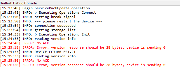 For 'Service Pack Update' option, Uniflash stops responding after following messages.