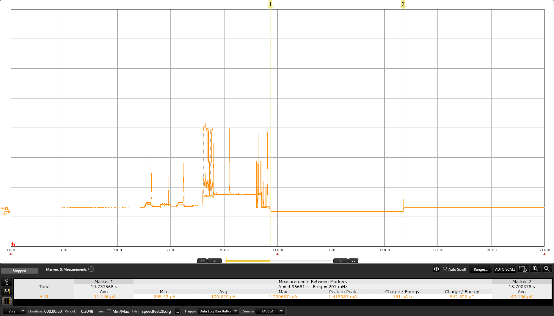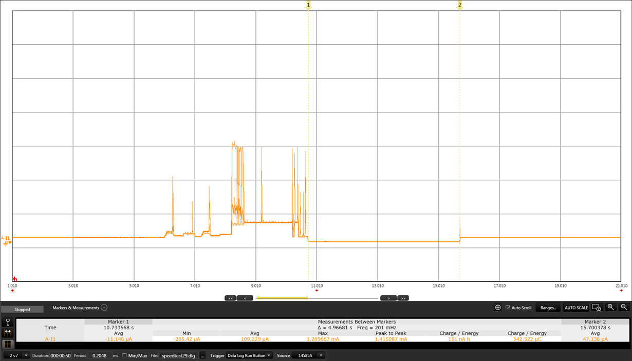 I then recorded the current via Jumper 12 with am power analyzer. It's visible, that the CC3200 goes into hibernation and comes out of it at the appropriate time, but doesn't continue the program.