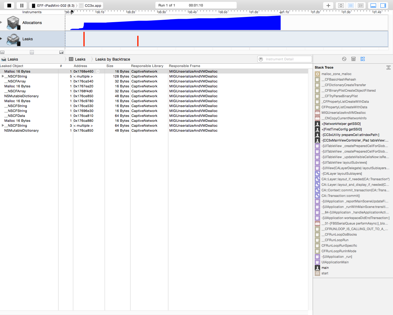 When I am running this app through instruments, I founded few Memory Leaks in Library files. I'm attaching the Screenshot here.
