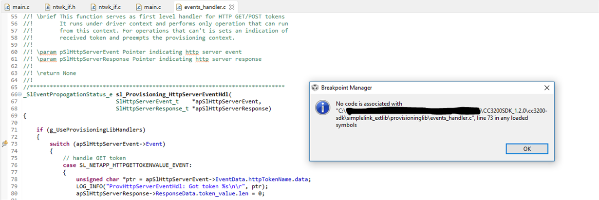 The project builds fine, however when I go through the provisioning process, none of the HTTP server callbacks are handled by provisioning lib, and are instead sent to the callback function defined in the oob main.c file. To prove this, I added a few simple lines of debug code to the HTTP server call back to output all the HTTP GET and POST requests that go un-handled. Below is the debug code I added to SimpleLinkHttpServerCallback():