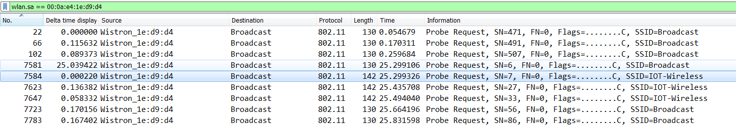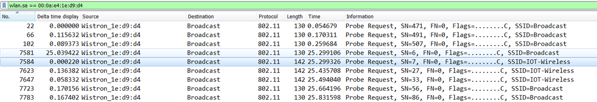 the Scan process should send probe packets on every channel (1-11), but in the sniffer log as attached, he can only find the packets on some specific channel like CH5. Is that because the stored SSID profile ever existed on CH5 or the Wi-Fi sniffer is not powerful enough to cover each channel?