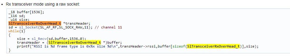 Regardless the length of the buffer, it seems I find the actualy received data exactly at the buffer pointer location. I don't understand where SlTransceiverRxOverHead_t header and how to read it if my buffer has a length < 8 bytes (i.e. reading one char at time).