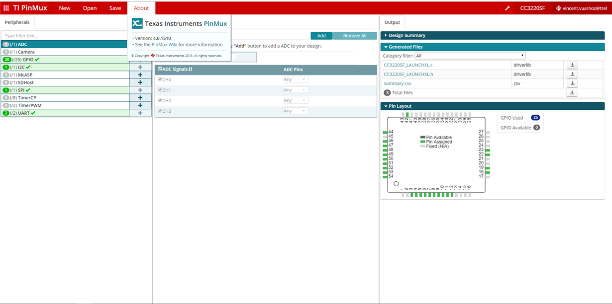 I have set up all my GPIOs in the PinMux tool (see pinmux file attached). But the CC3220SF_LAUNCHXL.h file doesn't seem to update. The "typedef enum CC3220SF_LAUNCHXL_GPIOName" still only contains the GPIO for the LAUNCHXL eval board (see below).