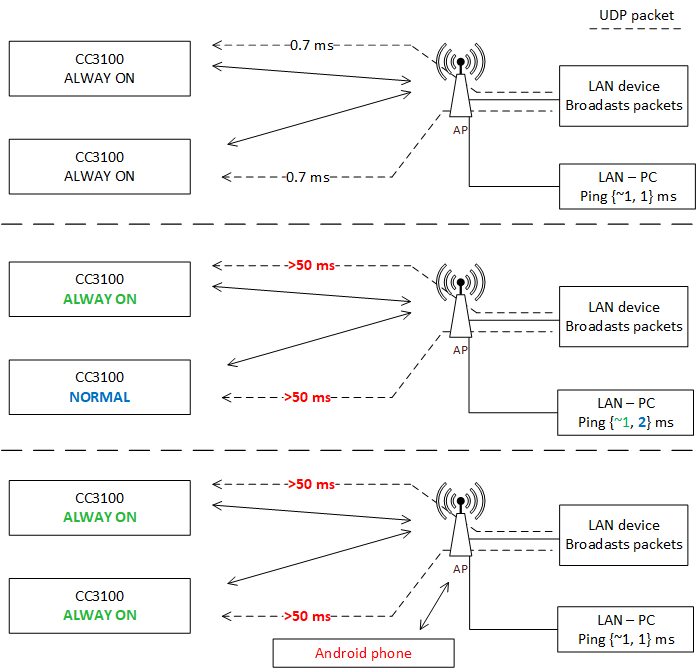 Everything is good when one CC3100 (always on power policy) is connected to AP (commercial type); the time between packet transmission (broadcast) from LAN device and reception on CC3100 is about 0.7 milliseconds.If another CC3100 connects to AP (also in always-on power mode) measured time is not affected. However, when I switch power policy to normal on one of the connected CC3100, measured time is affected on both devices and reaches about 70 ms or more. The same behavior can be observed if I connect android phone to AP. Nevertheless, the ping command is without a change (1 ms). Moreover, after some time, measured times will reach the expected values (1.5 ms for normal mode power policy and 0.7 ms for always-on policy) and few tens of seconds later situation goes back to 70 ms or more. This repeats.