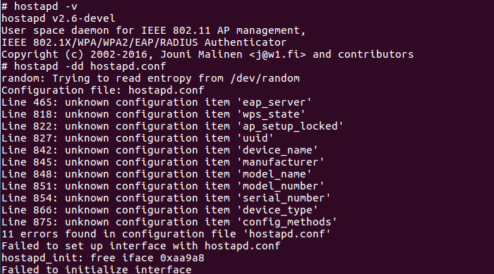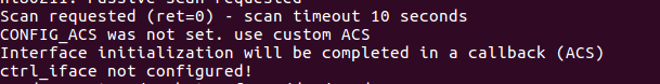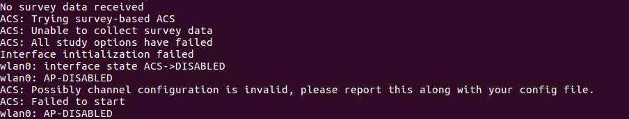 # hostapd -dd hostapd.conf random: Trying to read entropy from /dev/random Configuration file: hostapd.conf ctrl_interface_group=0 nl80211: Supported cipher 00-0f-ac:1 nl80211: Supported cipher 00-0f-ac:5 nl80211: Supported cipher 00-0f-ac:2 nl80211: Supported cipher 00-0f-ac:4 nl80211: Supported cipher 00-14-72:1 nl80211: Supports Probe Response offload in AP mode nl80211: Using driver-based off-channel TX nl80211: Supported vendor command: vendor_id=0x80028 subcmd=0 nl80211: Supported vendor command: vendor_id=0x80028 subcmd=1 nl80211: Supported vendor command: vendor_id=0x80028 subcmd=2 nl80211: Supported vendor event: vendor_id=0x80028 subcmd=0 nl80211: Supported vendor event: vendor_id=0x80028 subcmd=1 nl80211: Use separate P2P group interface (driver advertised support) nl80211: Enable multi-channel concurrent (driver advertised support) nl80211: use P2P_DEVICE support nl80211: interface wlan0 in phy phy2 nl80211: Set mode ifindex 8 iftype 3 (AP) nl80211: Setup AP(wlan0) - device_ap_sme=0 use_monitor=0 nl80211: Subscribe to mgmt frames with AP handle 0xae9a8 nl80211: Register frame type=0xb0 (WLAN_FC_STYPE_AUTH) nl_handle=0xae9a8 match= nl80211: Register frame type=0x0 (WLAN_FC_STYPE_ASSOC_REQ) nl_handle=0xae9a8 match= nl80211: Register frame type=0x20 (WLAN_FC_STYPE_REASSOC_REQ) nl_handle=0xae9a8 match= nl80211: Register frame type=0xa0 (WLAN_FC_STYPE_DISASSOC) nl_handle=0xae9a8 match= nl80211: Register frame type=0xc0 (WLAN_FC_STYPE_DEAUTH) nl_handle=0xae9a8 match= nl80211: Register frame type=0xd0 (WLAN_FC_STYPE_ACTION) nl_handle=0xae9a8 match= nl80211: Register frame type=0x40 (WLAN_FC_STYPE_PROBE_REQ) nl_handle=0xae9a8 match= rfkill: Cannot open RFKILL control device nl80211: RFKILL status not available nl80211: Add own interface ifindex 8 (ifidx_reason -1) nl80211: if_indices[16]: 8(-1) phy: phy2 BSS count 1, BSSID mask 00:00:00:00:00:00 (0 bits) wlan0: interface state UNINITIALIZED->COUNTRY_UPDATE Previous country code RU, new country code RU nl80211: Regulatory information - country=RU (DFS-ETSI) nl80211: 2402-2482 @ 40 MHz 20 mBm nl80211: 5170-5250 @ 80 MHz 20 mBm nl80211: 5250-5330 @ 80 MHz 20 mBm (DFS) nl80211: 5650-5730 @ 80 MHz 30 mBm (DFS) nl80211: 5735-5835 @ 80 MHz 30 mBm nl80211: 57000-66000 @ 2160 MHz 40 mBm nl80211: Added 802.11b mode based on 802.11g information Allowed channel: mode=1 chan=1 freq=2412 MHz max_tx_power=20 dBm Allowed channel: mode=1 chan=2 freq=2417 MHz max_tx_power=20 dBm Allowed channel: mode=1 chan=3 freq=2422 MHz max_tx_power=20 dBm Allowed channel: mode=1 chan=4 freq=2427 MHz max_tx_power=20 dBm Allowed channel: mode=1 chan=5 freq=2432 MHz max_tx_power=20 dBm Allowed channel: mode=1 chan=6 freq=2437 MHz max_tx_power=20 dBm Allowed channel: mode=1 chan=7 freq=2442 MHz max_tx_power=20 dBm Allowed channel: mode=1 chan=8 freq=2447 MHz max_tx_power=20 dBm Allowed channel: mode=1 chan=9 freq=2452 MHz max_tx_power=20 dBm Allowed channel: mode=1 chan=10 freq=2457 MHz max_tx_power=20 dBm Allowed channel: mode=1 chan=11 freq=2462 MHz max_tx_power=20 dBm Allowed channel: mode=1 chan=12 freq=2467 MHz max_tx_power=20 dBm Allowed channel: mode=1 chan=13 freq=2472 MHz max_tx_power=20 dBm Allowed channel: mode=2 chan=36 freq=5180 MHz max_tx_power=20 dBm Allowed channel: mode=2 chan=38 freq=5190 MHz max_tx_power=20 dBm Allowed channel: mode=2 chan=40 freq=5200 MHz max_tx_power=20 dBm Allowed channel: mode=2 chan=42 freq=5210 MHz max_tx_power=20 dBm Allowed channel: mode=2 chan=44 freq=5220 MHz max_tx_power=20 dBm Allowed channel: mode=2 chan=46 freq=5230 MHz max_tx_power=20 dBm Allowed channel: mode=2 chan=48 freq=5240 MHz max_tx_power=20 dBm Allowed channel: mode=2 chan=149 freq=5745 MHz max_tx_power=30 dBm Allowed channel: mode=2 chan=153 freq=5765 MHz max_tx_power=30 dBm Allowed channel: mode=2 chan=157 freq=5785 MHz max_tx_power=30 dBm Allowed channel: mode=2 chan=161 freq=5805 MHz max_tx_power=30 dBm Allowed channel: mode=2 chan=165 freq=5825 MHz max_tx_power=30 dBm Allowed channel: mode=0 chan=1 freq=2412 MHz max_tx_power=20 dBm Allowed channel: mode=0 chan=2 freq=2417 MHz max_tx_power=20 dBm Allowed channel: mode=0 chan=3 freq=2422 MHz max_tx_power=20 dBm Allowed channel: mode=0 chan=4 freq=2427 MHz max_tx_power=20 dBm Allowed channel: mode=0 chan=5 freq=2432 MHz max_tx_power=20 dBm Allowed channel: mode=0 chan=6 freq=2437 MHz max_tx_power=20 dBm Allowed channel: mode=0 chan=7 freq=2442 MHz max_tx_power=20 dBm Allowed channel: mode=0 chan=8 freq=2447 MHz max_tx_power=20 dBm Allowed channel: mode=0 chan=9 freq=2452 MHz max_tx_power=20 dBm Allowed channel: mode=0 chan=10 freq=2457 MHz max_tx_power=20 dBm Allowed channel: mode=0 chan=11 freq=2462 MHz max_tx_power=20 dBm Allowed channel: mode=0 chan=12 freq=2467 MHz max_tx_power=20 dBm Allowed channel: mode=0 chan=13 freq=2472 MHz max_tx_power=20 dBm Scan for neighboring BSSes to select channel wlan0: nl80211: scan request nl80211: Passive scan requested Scan requested (ret=0) - scan timeout 10 seconds ACS: Automatic channel selection started, this may take a bit ACS: Scanning 1 / 1 wlan0: nl80211: scan request nl80211: Passive scan requested nl80211: Scan frequency 2412 MHz nl80211: Scan frequency 2417 MHz nl80211: Scan frequency 2422 MHz nl80211: Scan frequency 2427 MHz nl80211: Scan frequency 2432 MHz nl80211: Scan frequency 2437 MHz nl80211: Scan frequency 2442 MHz nl80211: Scan frequency 2447 MHz nl80211: Scan frequency 2452 MHz nl80211: Scan frequency 2457 MHz nl80211: Scan frequency 2462 MHz nl80211: Scan frequency 2467 MHz nl80211: Scan frequency 2472 MHz nl80211: Scan trigger failed: ret=-16 (Device or resource busy) nl80211: Set mode ifindex 8 iftype 2 (STATION) nl80211: Teardown AP(wlan0) - device_ap_sme=0 use_monitor=0 nl80211: Unsubscribe mgmt frames handle 0x88826121 (AP teardown) nl80211: Subscribe to mgmt frames with non-AP handle 0xac288 nl80211: Register frame type=0xd0 (WLAN_FC_STYPE_ACTION) nl_handle=0xac288 match=0104 nl80211: Register frame type=0xd0 (WLAN_FC_STYPE_ACTION) nl_handle