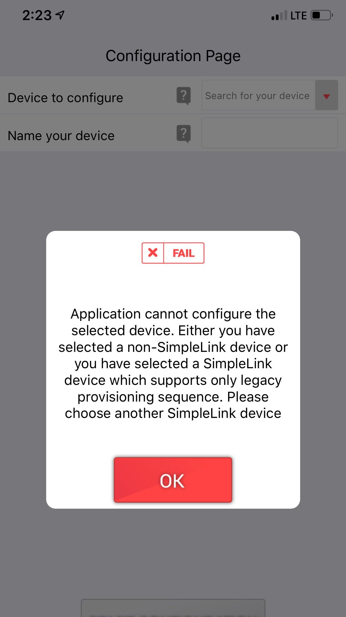 I am using the provisioning example from the SDK CC32XX Version 3.10.00.04 and attempting to provision my CC3220SF using the SimpleLink Wi-Fi Starter Pro app on iOS. I'm flashing the code using Uniflash and have some settings changed in Uniflash attempting to open port 443 so I can post to an AWS server in my user application code. However, when I have the secured checkbox checked under the HTTP Server tab in Uniflash the app is unable to configure the device even though I am connected to the "mysimplelink-xxxxxx" wifi that my device produces. I need this port opened in order to accomplish my project's needs, but all of my code is supposed to run after the device is provisioned. I've provided a screenshot of the error message that the app gives me, and I'd appreciate any help I could get in resolving this issue!
