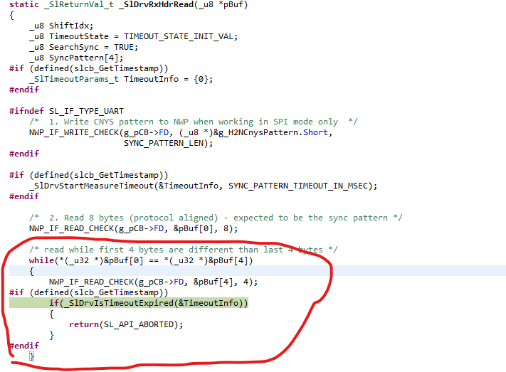 At some point _SlDrvRxHdrRead() is not returning, i stepped through the code and found code is not coming out of the while loop refer below,