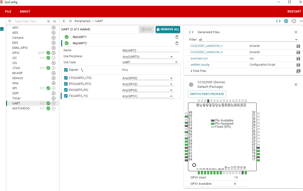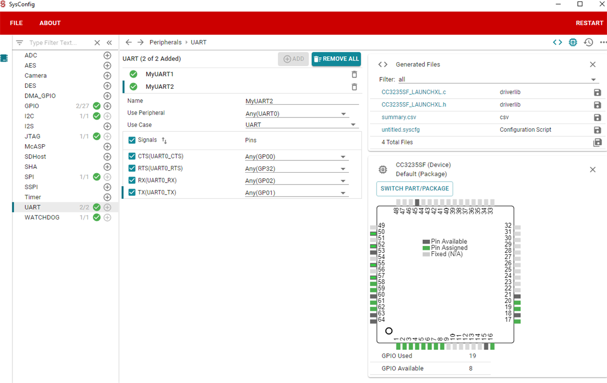 So in order to use the 2 UARTs, I imported the generated files: CC3235SF_LAUNCHXL.c, CC3235SF_LAUNCHXL.h.