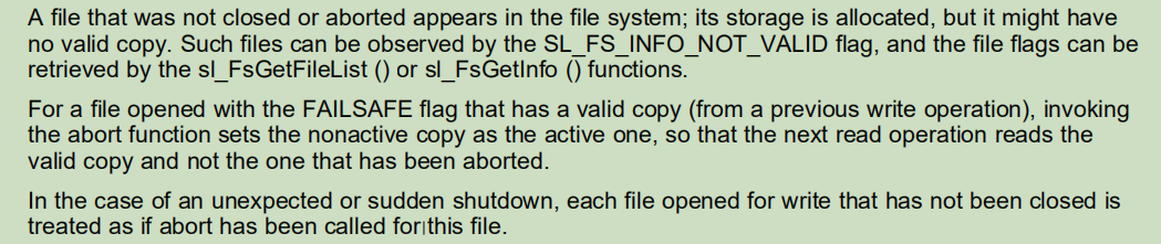 1. I know sl_Fsclose(fileHdl, 'A', 1) means abort function, and it will set the nonactive copy as the active one if the file is opened with FAILSAFE flag. However, it is strange when I write the test code to verify the file system, the abort function acts as the normal close(sl_Fsclose(fileHdl, certificate, signature, signature_len)). Although I can ignore this strange problem, I'm not sure wheather it will bring some other problems for me in the future.