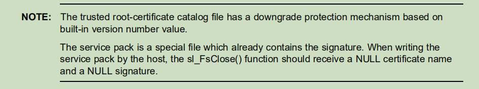 2.I have referred the documentationintroducing file system, which shows servicepack is a special file and when the host writing the service pack, the sl_FsClose() function should receive a NULL certificate name and a NULL signature. The sl_FsClose() function returns -10363(SL_ERROR_FS_ILLEGAL_SIGNATURE) when I follow the guide, but another strange problem happens, sl_FsClose() succeeds if i give an arbitrary string to signature, for example, sl_FsClose(fileHdl, NULL, "123", 3), sl_FsClose(fileHdl, NULL, "ab", 2), and so on.
