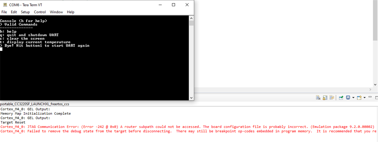 I've downloaded an example program: portable_CC3220SF_LAUCHXL_freertos_ccs.I was able to execute this program but every time I press 'q', I get the following error message:
