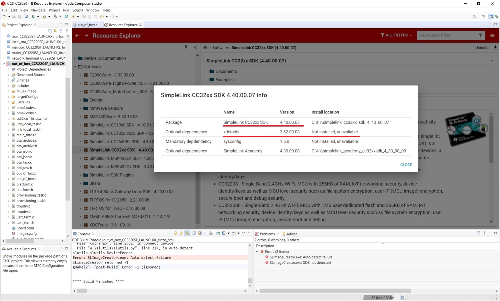 I believe it is due to the absence of the XDCTOOLS 3.62.00.08 component shown in figure 1.