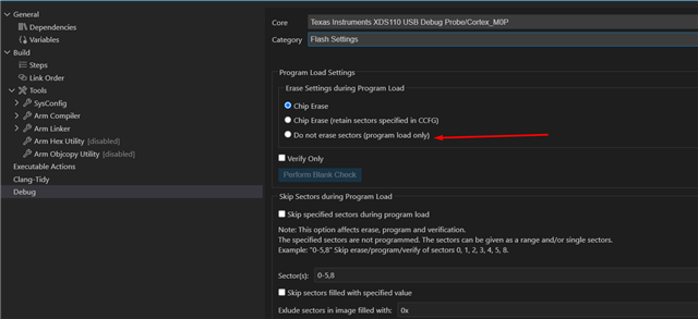 I've attempted to modify the flash settings in Code Composer Studio to prevent a full erase, as shown in the image below. However, this resulted in an error during the program load.