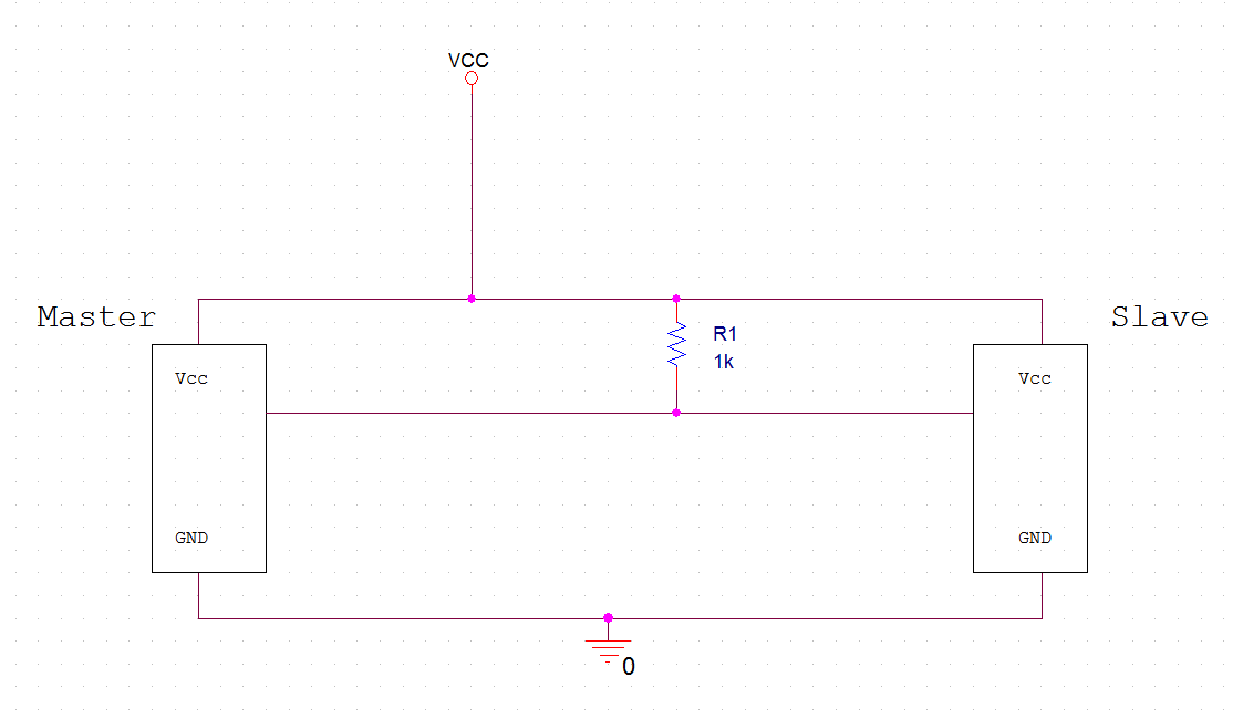 -Master configuration: pin 1.4 as input, INT enabled, no pullups. By default the input will be high, until the slave pulls down the line.