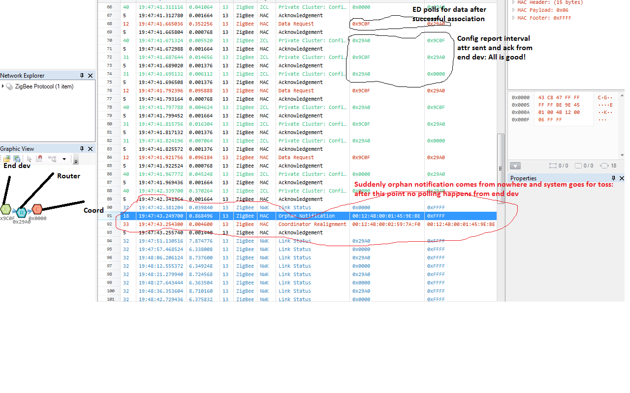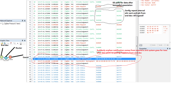 The coordinator thinks that end node is connected to itself and hence waits for it to poll, but end node polls the router as cordinator is out of range. Hence no data goes through.