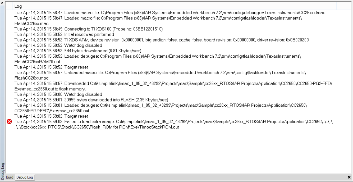 I'm trying to run the example msa_cc2650 - FFD application explained in the MAC User's Guide. With some assistance from Suyash(e2e.ti.com/.../1479691) I'm now able to build the software but now, every time I attempt to Download the software I get the following error: