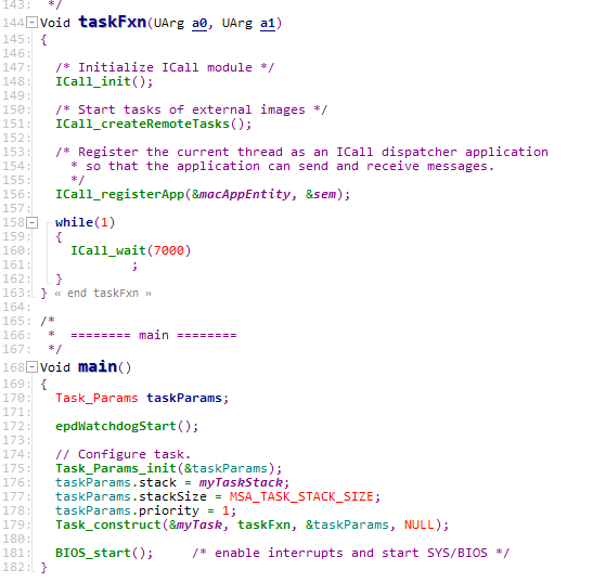 Void taskFxn(UArg a0, UArg a1) { #if defined( USE_FPGA ) SysCtrlPowerEverything(); Power_setConstraint(Power_SB_DISALLOW); Power_setDependency(PERIPH_RFCORE, Power_GLOBAL); #endif /* Disallow shutting down JTAG, VIMS, SYSBUS during idle state * since TIMAC requires SYSBUS during idle. */ Power_setConstraint(Power_IDLE_PD_DISALLOW); /* Initialize ICall module */ ICall_init(); // #ifdef FEATURE_MAC_SECURITY CryptoCC26XX_Params CryptoCC26XXParams; extern CryptoCC26XX_Handle CryptoCC26XXHandle; CryptoCC26XX_init(); CryptoCC26XX_Params_init(&CryptoCC26XXParams); CryptoCC26XXHandle = CryptoCC26XX_open(Board_CRYPTO, false, &CryptoCC26XXParams); if (!CryptoCC26XXHandle) { Task_exit(); } Crypto_init(); /* * Copy the extended address from the CCFG area * Assumption: the memory in CCFG_IEEE_MAC_0 and CCFG_IEEE_MAC_1 * is contiguous and LSB first. */ memcpy(msa_ExtAddr, (uint8_t *)&(__ccfg.CCFG_IEEE_MAC_0), EXTADDR_LEN); /* Check to see if the CCFG IEEE is valid */ if(memcmp(msa_ExtAddr, dummyExtAddr, EXTADDR_LEN) == 0) { /* No, it isn't valid. Get the Primary IEEE Address */ memcpy(msa_ExtAddr, (uint8_t *)(FCFG1_BASE + EXTADDR_OFFSET), EXTADDR_LEN); } #endif // #ifdef NV_RESTORE /* Setup the NV driver */ NVOCTP_loadApiPtrs( &user1Cfg.nvFps ); if ( user1Cfg.nvFps.initNV ) { user1Cfg.nvFps.initNV( NULL ); } pfnMacCfgNvFps = &user1Cfg.nvFps; #endif // /* Start tasks of external images */ ICall_createRemoteTasks(); /* Kick off application */ PRCMPowerDomainOn(PRCM_DOMAIN_PERIPH); PRCMPeripheralRunEnable(PRCM_PERIPH_GPIO); PRCMLoadSet(); while (!PRCMLoadGet()) { ; } Task_sleep(100000); epdWatchdogStart(); IOCPinTypeGpioOutput(IOID_6); while(1) { GPIOPinWrite(GPIO_PIN_6, 1); ICall_wait(ICALL_TIMEOUT_FOREVER); } }