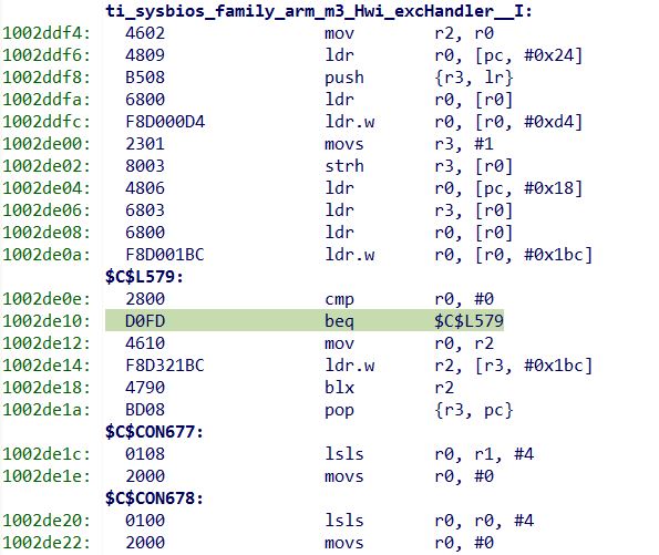 Is there an easy way to debug these crashes? From a disassembly view I see that it is hitting "ti_sysbios_family_arm_m3_Hwi_excHandler__I" and going into some sort of while(1) loop (see image below) .