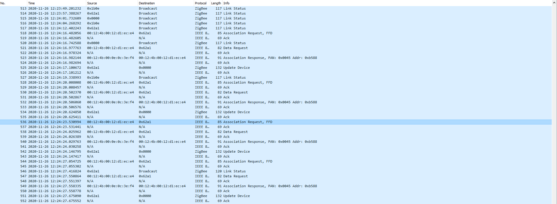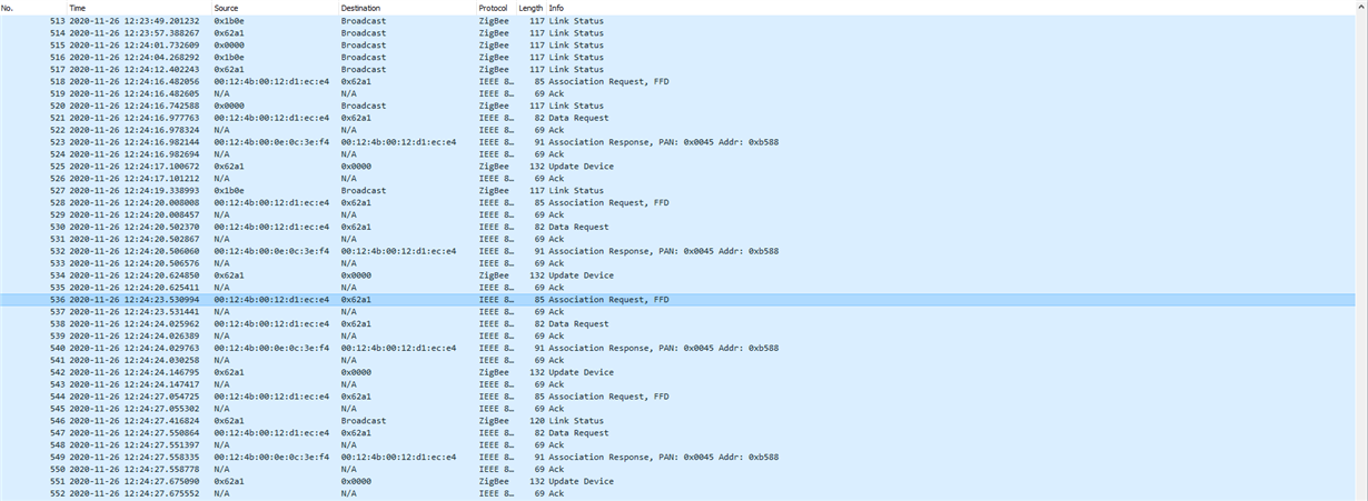 - But after Association response, the network joining procedure ( Device Announcement, Match Descriptor, Transport key check) did not happen